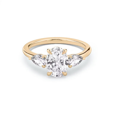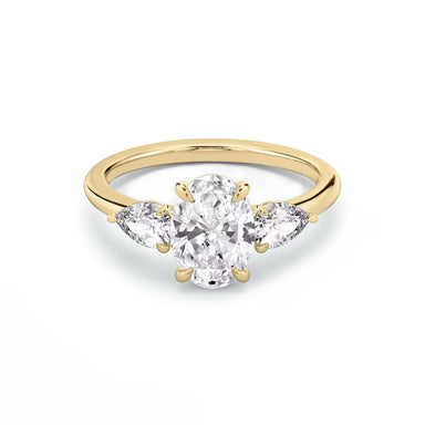 Ring Description The Ariana features lab grown diamonds, 1 oval diamond in the centre and 2 pear shape diamonds on the sides. Handcrafted on a clas...